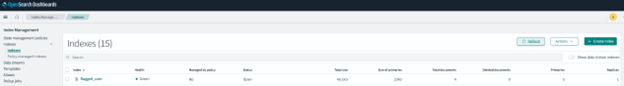 Next, let’s look into OpenSearch to see flagged transactions. Go to Amazon OpenSearch Service in your AWS Console, click OpenSearch Dashboards and go into Index Management, here you’ll be able to see a flagged_user index which will hold all suspicious activity: