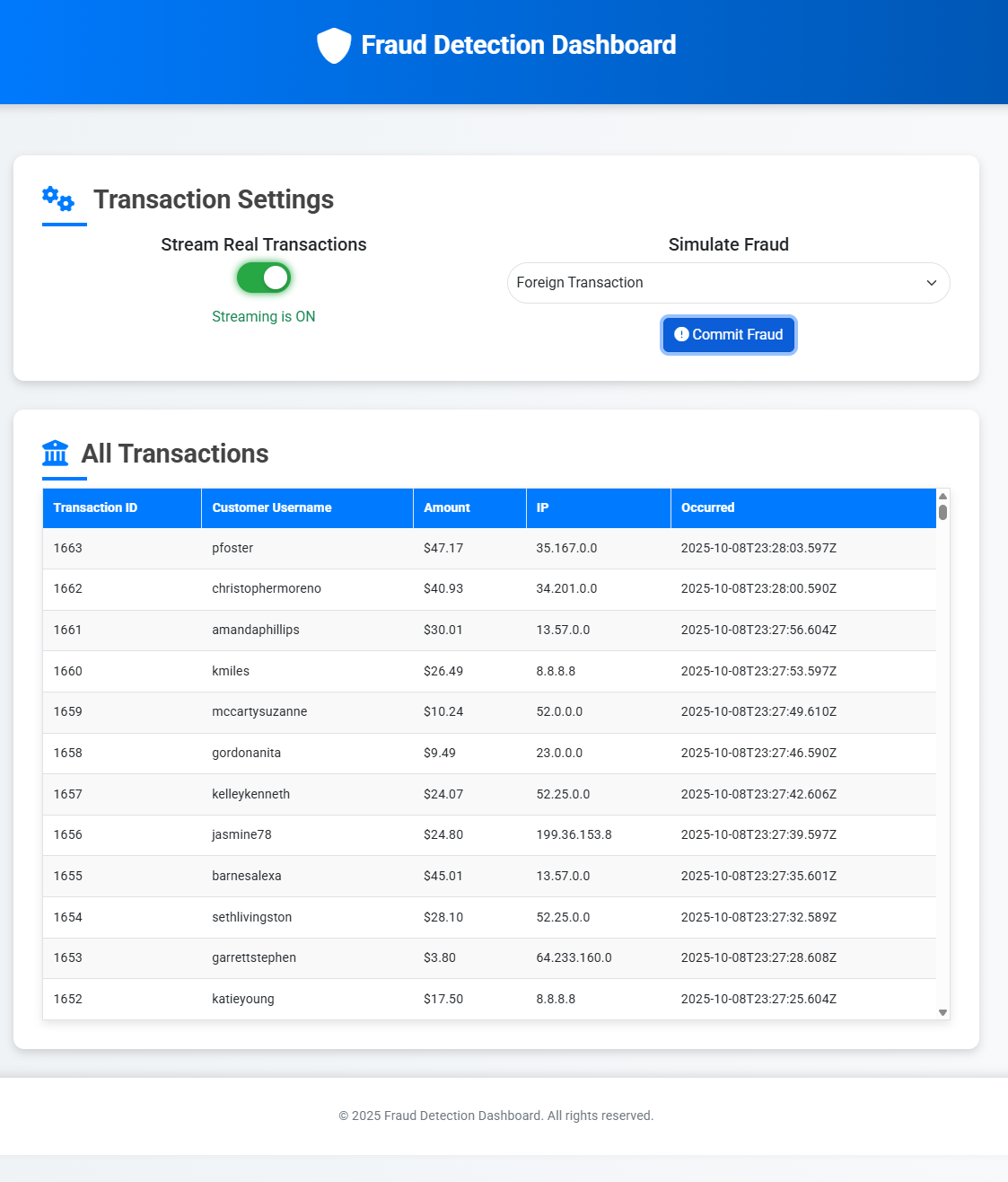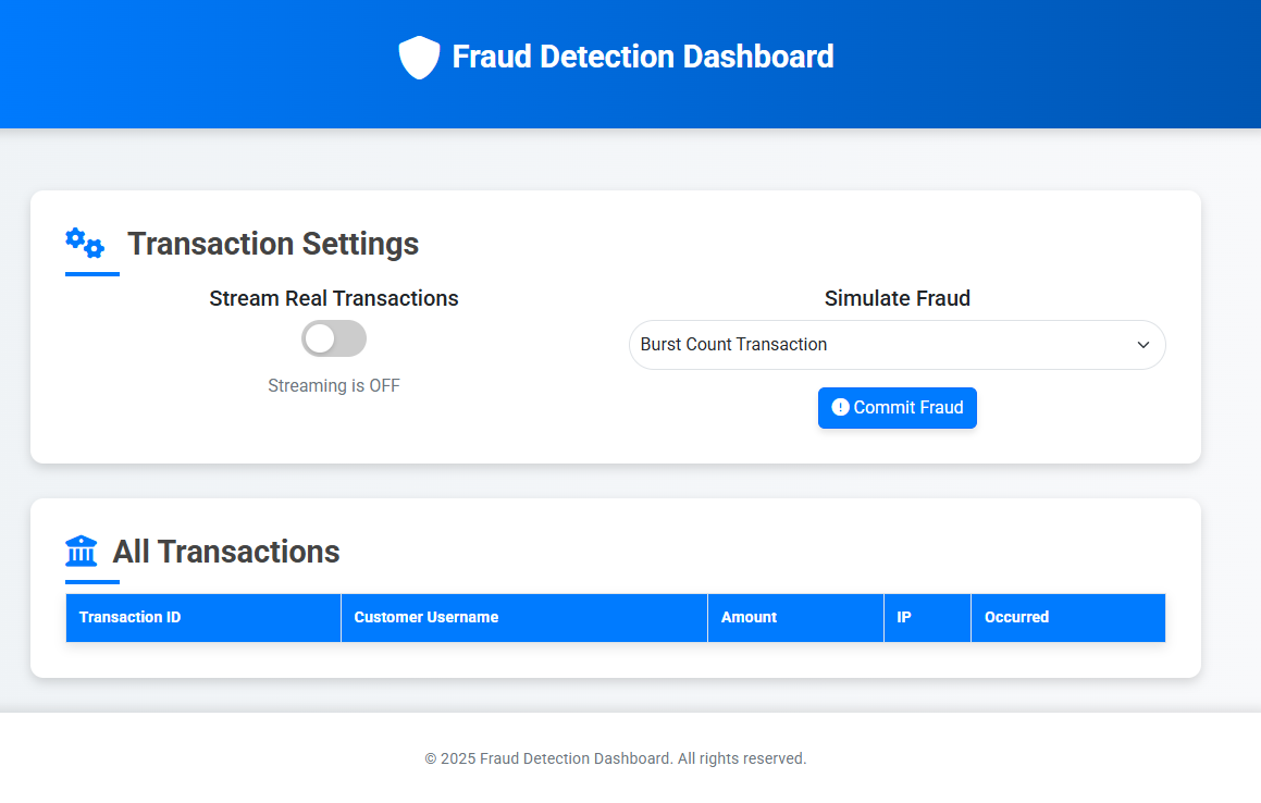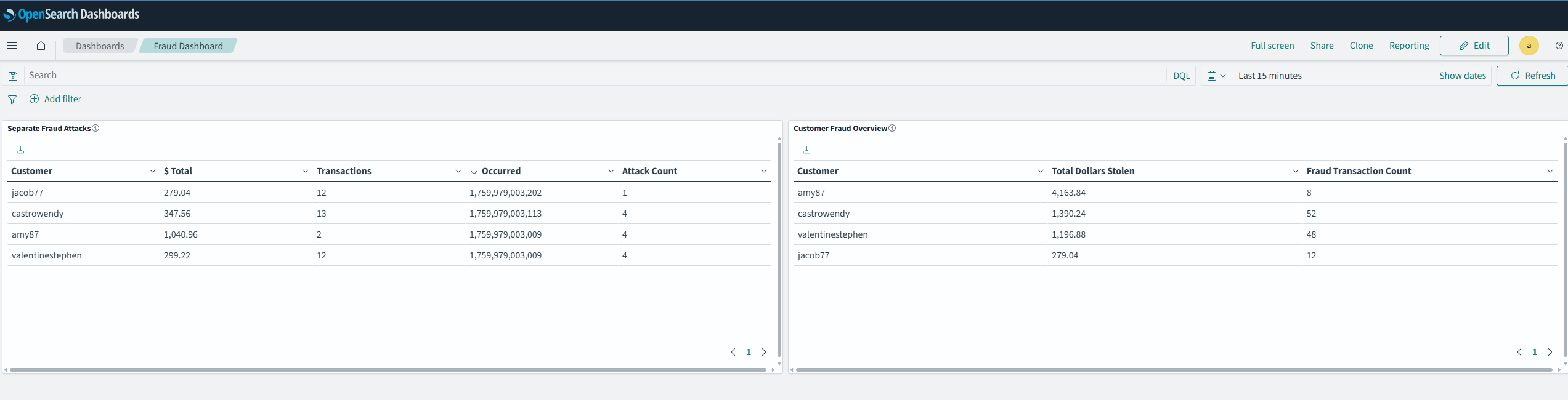 - You can see dashboards describing fraud events determined via flink in real-time.