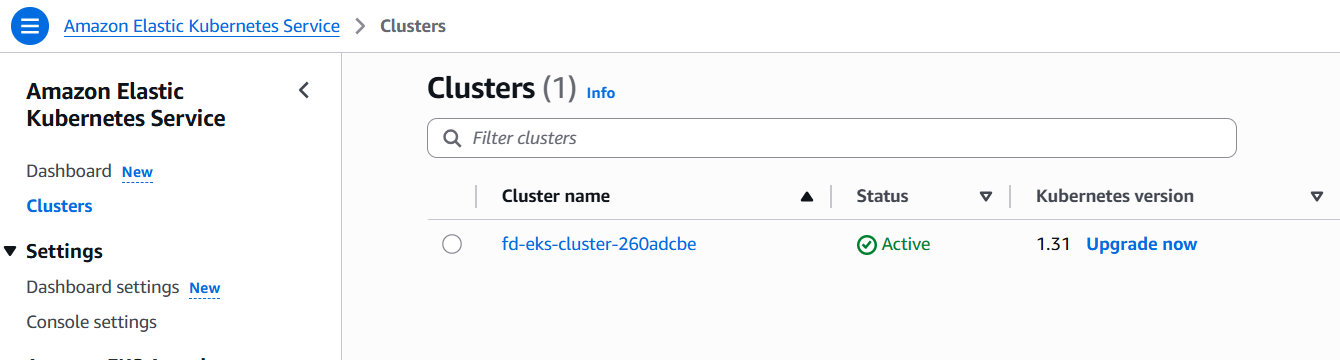 Navigating to EKS you will find one Elastic Kubernetes Service cluster.