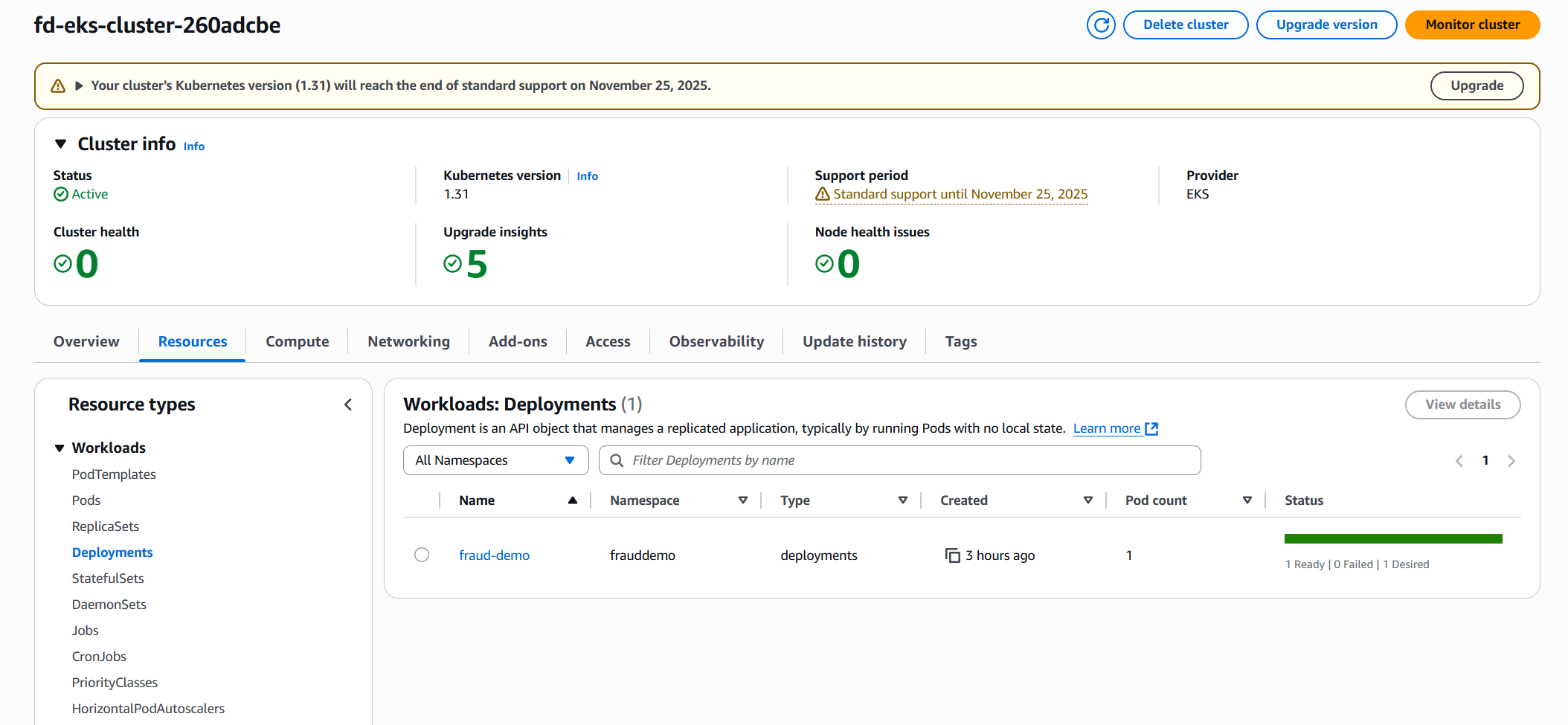 Inspecting the cluster resources you will see the fraud-demo deployment running, which is the web application we will use to simulate transactions: