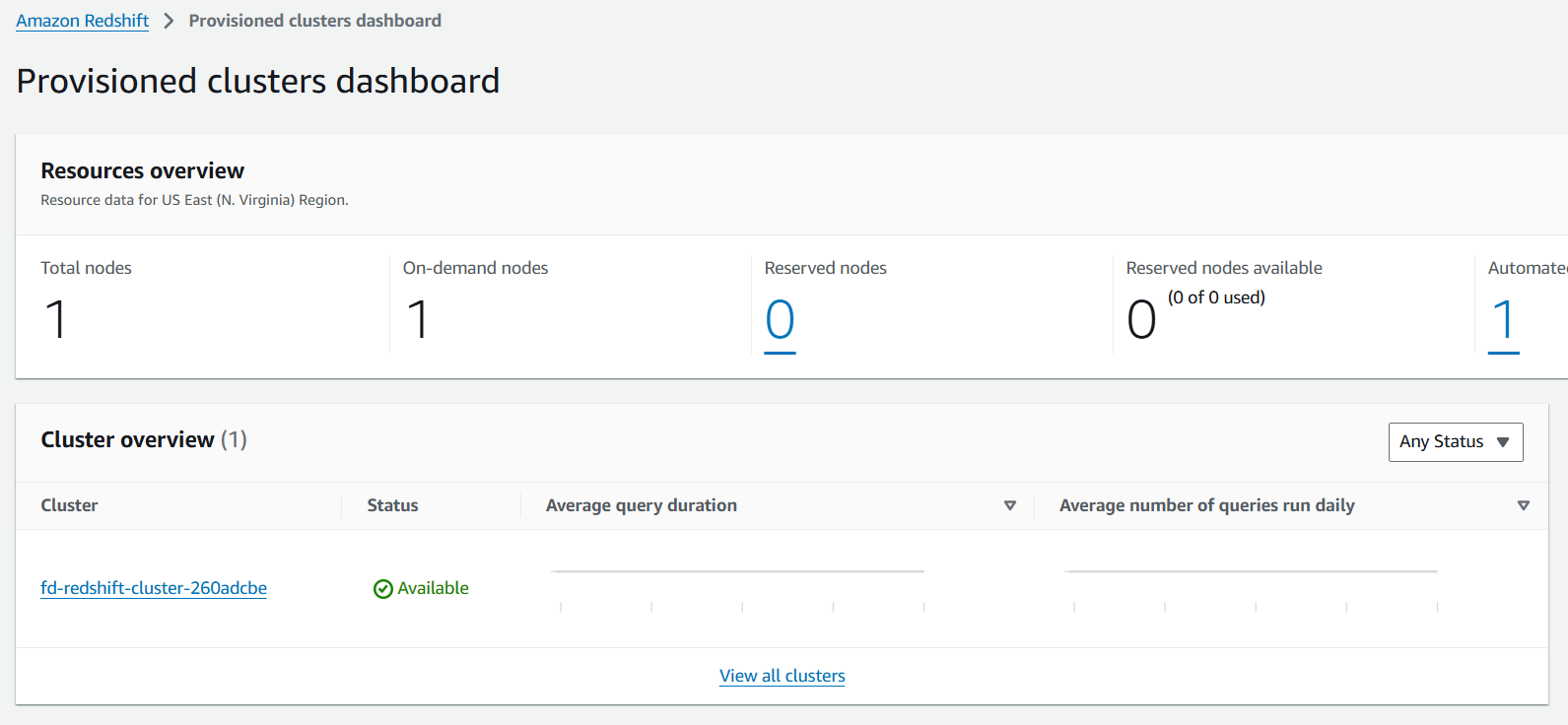 Finally, navigate to Amazon Redshift to see a cluster running, this cluster will be the target for all transactions identified as potentially fraudulent.