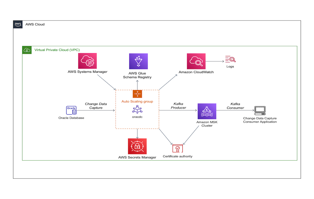 - Streaming of Oracle RDBMS data changes using tight integration with Amazon MSK (Support for IAM, SCRAM, Mutual TLS), AWS Secrets Manager, and AWS Glue Schema Registry (Avro/JSON/Protobuf).