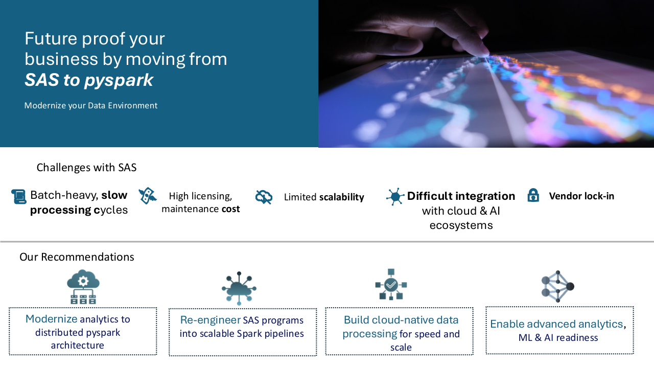 - Enables up to 40-60% reduction in TCO by eliminating legacy licensing fees and leveraging scalable, cloud-native Pyspark