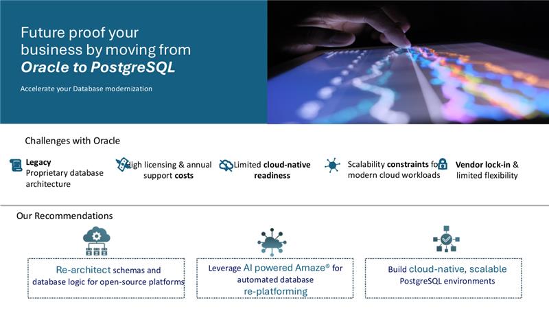 Hexaware’s Oracle to PostgreSQL Migration offering empowers enterprises to modernize legacy Oracle database workloads by transitioning to scalable, cloud-native PostgreSQL platforms. Clients achieve significant cost savings by eliminating expensive Oracle licensing fees and lowering operational overhead by 50-70%. This modernization accelerates database performance and scalability while enabling cloud agility and multi-cloud deployment. The solution enhances data governance, security, and integration capabilities, helping businesses reduce vendor lock-in and future-proof their critical data infrastructure for ongoing innovation and digital transformation.