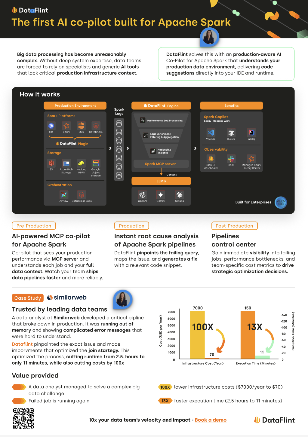 DataFlint is the first AI co-pilot built for Apache Spark. It helps data teams debug and optimize Spark jobs in minutes instead of hours. The SaaS platform provides real-time visibility into job performance through a unified dashboard, with metrics across clusters, efficiency scores, cost trends, and automated root-cause alerts. Unlike generic AI tools, DataFlint is production-aware. It learns directly from your Spark logs and execution plans to deliver precise, context-aware code suggestions in your IDE (VS Code, IntelliJ, or Cursor). These include actionable fixes like adjusting partitioning, tuning executor memory, and optimizing joins. Teams using DataFlint achieve up to 10x faster job runtimes and 10x lower infrastructure costs, while gaining centralized monitoring and continuous performance insights across all Spark jobs.