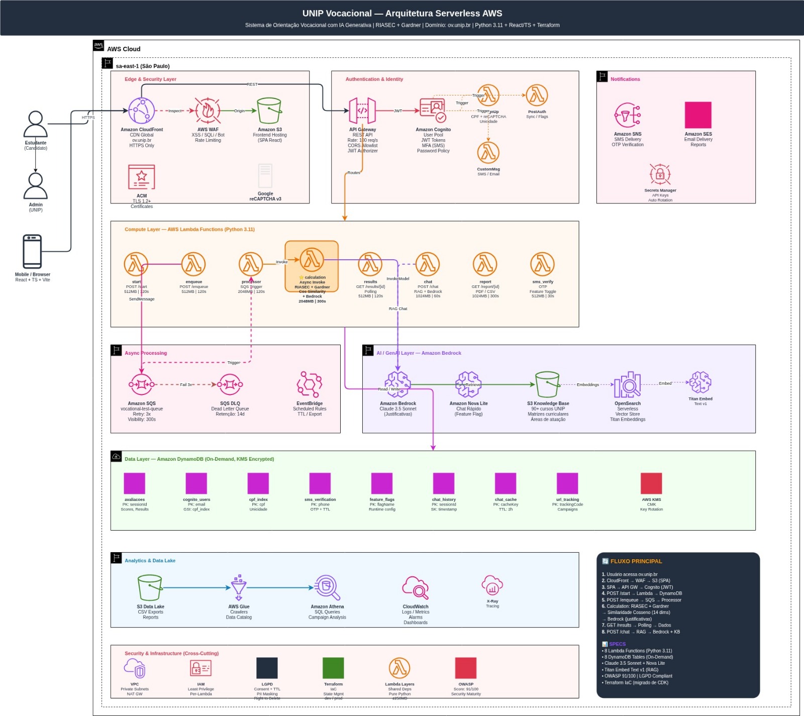 O motor vocacional é implementado como uma função serverless em AWS Lambda, desenvolvida em Python. Essa função processa as respostas do teste, aplica os modelos RIASEC/Holland e Gardner, calcula os scores e clusters comportamentais e cruza os resultados com a matriz de cursos da UNIP. Por ser serverless, o Lambda escala automaticamente conforme a demanda, sem necessidade de provisionamento manual, o que é especialmente crítico durante os picos de acesso em períodos de vestibular.