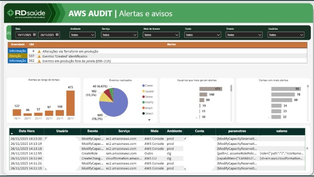 - Visibilidade em escala organizacional: A centralização dos eventos de mudança através do AWS CloudTrail Lake proporciona detecção de anomalias em toda a organização, suportando a estratégia de segurança corporativa da RD Saúde.