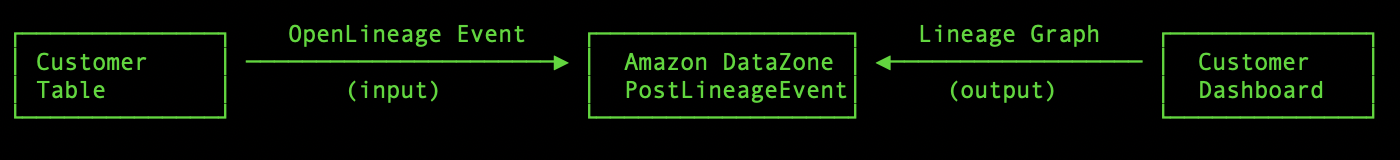O Amazon DataZone aceita eventos no formato OpenLineage, um padrão aberto para rastreamento de linhagem de dados. O evento descreve um job (a transformação), seus inputs e outputs. Aqui temos dois pontos chave: