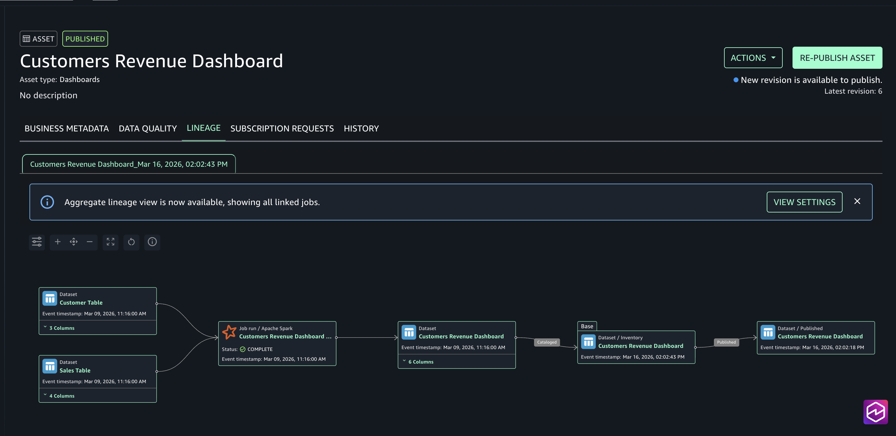 Ao final dos passos anteriores, podemos ver que o grafo de linhagem foi corretamente publicado no nosso asset customizado.