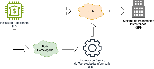 O ecossistema de pagamentos instantâneos brasileiro envolve três atores centrais: Banco Central do Brasil (BACEN), Provedores de Serviços de Tecnologia da Informação (PSTI) e Instituições de Pagamento (IPs) ou Financeiras (IF). O BACEN regula o sistema e mantém a infraestrutura central. Os PSTIs operam links e serviços dedicados à Rede do Sistema Financeiro Nacional (RSFN). As IPs enviam e recebem mensagens do PIX utilizando o padrão ISO 20022 por meio desses links. Detalhes operacionais de conexão podem ser encontrados no blog post da AWS Brasil sobre como conectar ambientes na AWS à RSFN.