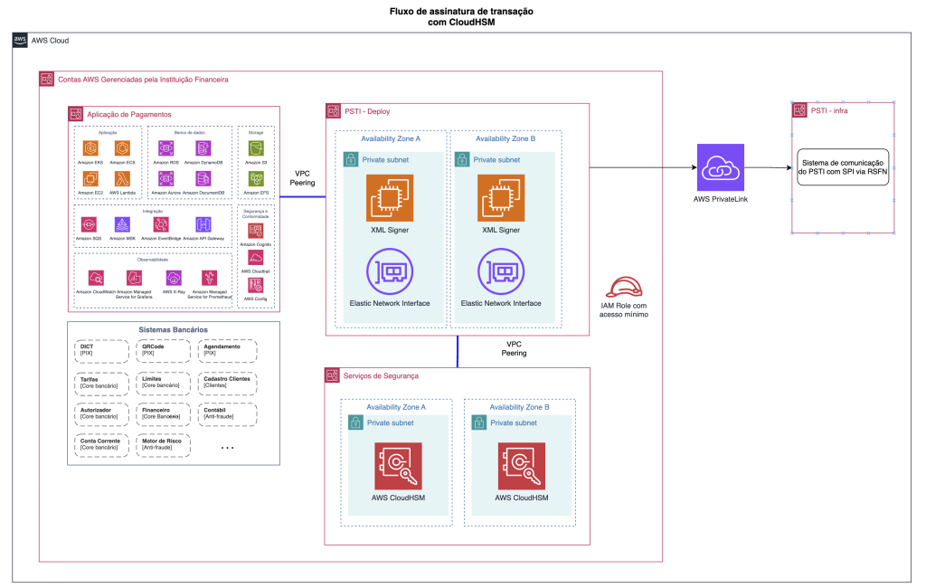 O CloudHSM oferece integração com bibliotecas padrão da indústria como PKCS#11 e JCE, facilitando a migração de aplicações existentes. A arquitetura mantém o princípio de segregação, com as aplicações na conta de implantação do PSTI acessando o cluster HSM através de conexões seguras e autenticadas via Elastic Network Interface, permitindo comunicação direta entre as VPCs através de VPC Peering, além de ter Security Groups para permitir maior controle de proteção.