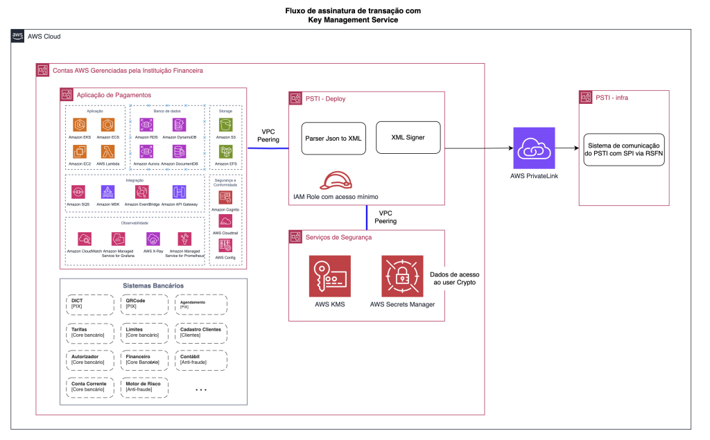 Dado o prazo de adoção das medidas do BACEN, um movimento que observamos no mercado são alguns PSTIs visando acelerar a adoção e o cumprimento das regras, entregando pacotes de aplicações de integração com KMS ou CloudHSM prontos para que as empresas façam a implantação direto em sua infraestrutura. Esta abordagem remove a complexidade da instituição financeira construir toda integração, com o benefício desse componente da carga de trabalho estar sob seu domínio, cumprindo assim o requisito de não compartilhamento de chaves e realizando a assinatura em seu domínio. Neste modelo, a instituição financeira assume a responsabilidade pelo uso do serviço de gestão de chaves criptográficas em seu ambiente, incluindo a implantação da arquitetura, a criação e gerenciamento das chaves criptográficas, bem como a integração com os serviços fornecidos pelo PSTI. Porém, destacamos que esta não é uma opção obrigatória e que diferentes abordagens e padrões arquiteturais podem ser aplicados. As alternativas incluem desde a produção do XML e assinatura diretamente no ambiente da instituição financeira, até a comunicação com o PSTI para que este devolva o XML e a própria instituição realize a assinatura em seu domínio.