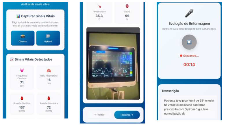Na sequência, os sinais vitais são registrados de forma automatizada através de uma fotografia do monitor multiparâmetro, eliminando a necessidade de transcrição manual dos dados. Como etapa final da visita, o profissional pode gravar um áudio descrevendo a situação clínica do paciente, que é automaticamente transcrito e sumarizado pela solução. Este registro inclui o estado atual do paciente, queixas relatadas, necessidades de intervenção médica e toda a evolução assistencial que tradicionalmente seria anotada no sistema de prontuário eletrônico