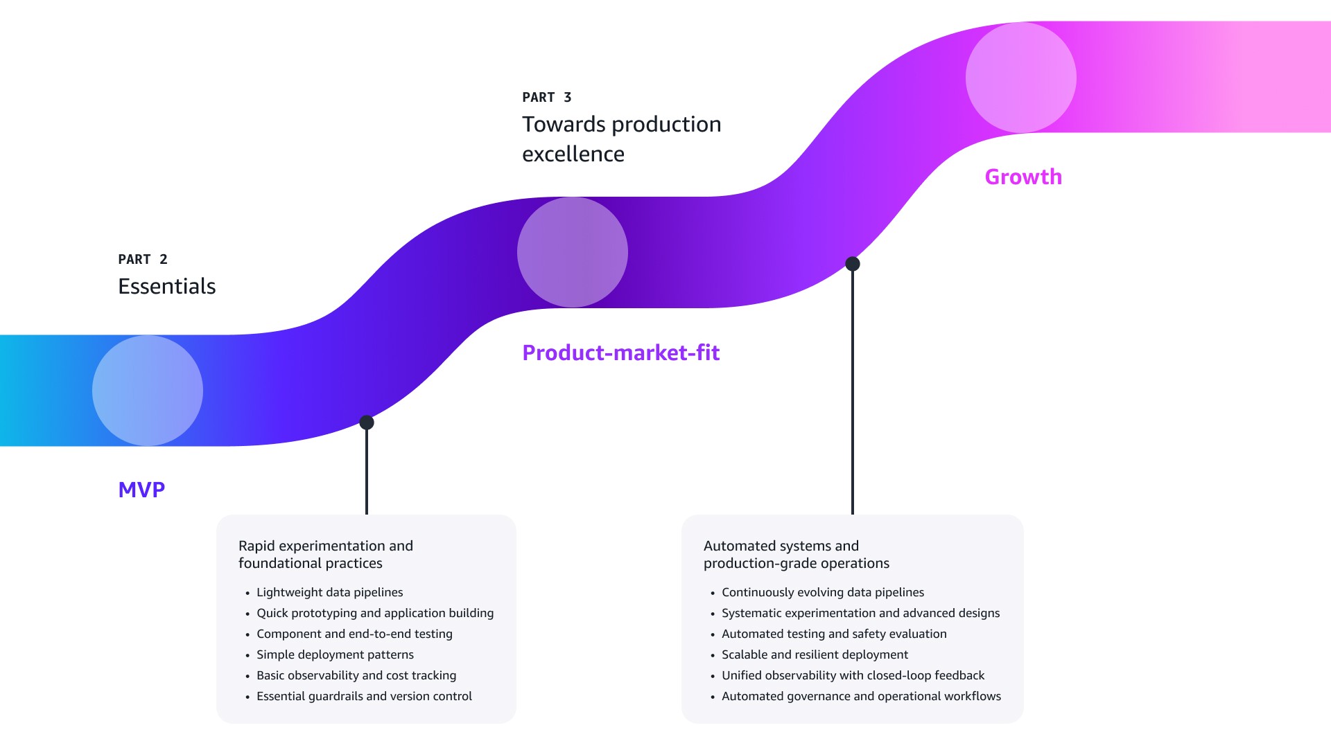 Reaching production excellence isn't just about managing more traffic. It's about building a pipeline that works reliably, efficiently, and predictably at scale. This means automating manual processes, establishing systematic experimentation and deployment, and implementing observability to understand not just what's happening, but why. As illustrated below, this evolution happens through operational shifts across six pipeline stages—from the essentials that took you from MVP to product-market fit to the automated systems that enable sustainable growth. Let's explore how to evolve each stage.