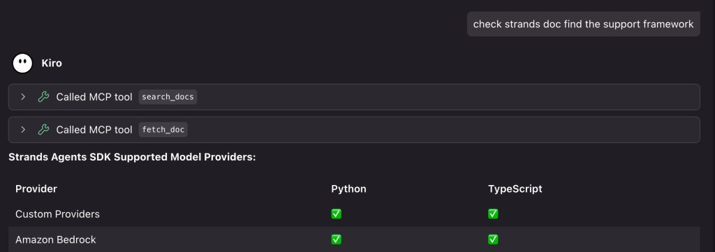 ถึงตอนนี้ MCP servers ทั้งสองตัวควรจะแสดงอยู่ใน Kiro MCP list แล้ว พร้อมให้เราทดสอบเรียกใช้งาน tools ต่างๆ