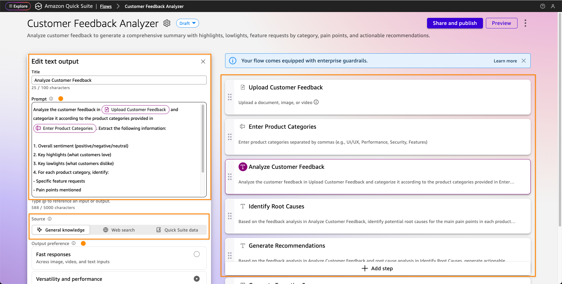 คุณสามารถเริ่มต้นด้วย Business Requirements แล้ว Quick Flows จะสร้าง Flow ที่ประกอบไปด้วยหลาย ๆ ขั้นตอน ทั้งขั้นตอนการ Input ข้อมูล, การรวบรวมข้อมูล, แบ่งกลุ่มการทำ Reasoning สำหรับการประมวลผลด้วย AI, และขั้นตอนการสร้าง Output เป็นผลลัพธ์สุดท้าย