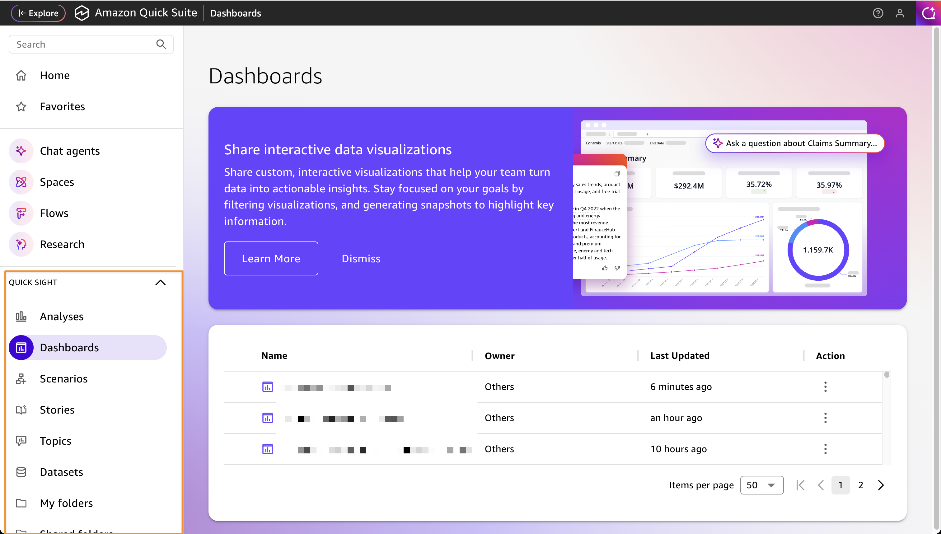 Chat agents – Quick Suite รวม Insights agents ที่คุณสามารถใช้เพื่อโต้ตอบกับข้อมูลและ Workflow ของคุณผ่านภาษาปกติ ซึ่ง Quick Suite รวม Built-in agent เพื่อตอบคำถามทั่วไปกับข้อมูลของคุณและ Custom chat agents ที่คุณสามารถกำหนดค่าโดยให้มีความเชี่ยวชาญเฉพาะด้านรวมถึงเข้าใจบริบทของธุรกิจ โดย Custom Chat Agents สามารถปรับแต่งให้เหมาะสำหรับแผนกหรือกรณีการใช้งานที่เฉพาะ เช่น Sales Agent ที่เชื่อมต่อกับข้อมูล Catalog และข้อมูลราคา โดยจะเก็บไว้ใน Space หรือ Compliance Agent ที่กำหนดค่าด้วยข้อกำหนดด้านกฎระเบียบและการดำเนินการเพื่อขออนุมัติ