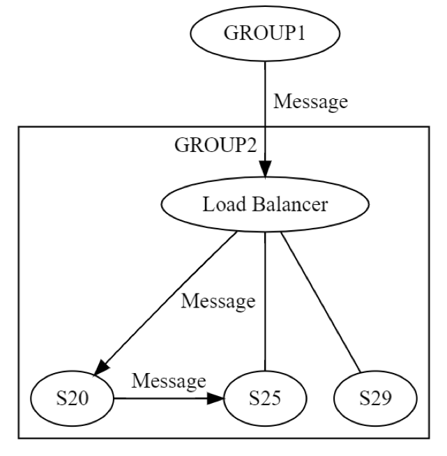 At first, a message to GROUP2 is sent, via the load balancer, to one machine (possibly S20) within the group. The designers of the system know that S20 might fail during the UPDATE STATE phase. As a result, S20 may need to pass the message to at least one other machine, either one of its peers or a machine in a different group. How does S20 actually do this? By sending a request/reply message to, say, S25, as shown in the following diagram.