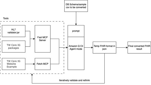 大語言模型在此處便可以發揮用處。我們可以讓LLM扮演專業的醫療資訊知識人員,協助建置資料的第一份FHIR格式,並用既有的驗證工具輔助驗證結果。驗證成功後,廠商即可進行標準化的轉換格式開發。本文將介紹如何運用Amazon Q CLI的 agent模式,結合FHIR validator MCP (Model Context Protocol),自動化No-code的生成並驗證符合台灣核心實作指引的醫材量測資料FHIR格式,大幅提升醫療資料標準化的效率與準確性,加速醫療器材的開發。