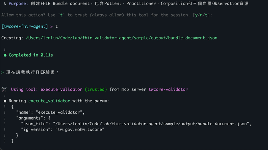 3. FHIR Validator MCP:提供標準的FHIR驗證能力,並使用確保生成資料符合台灣TW Core IG規範。本方案透過Fast MCP,包裝HK7所提供的validator.jar,並以TW Core IG 0.32 packages為Implementation Guide。