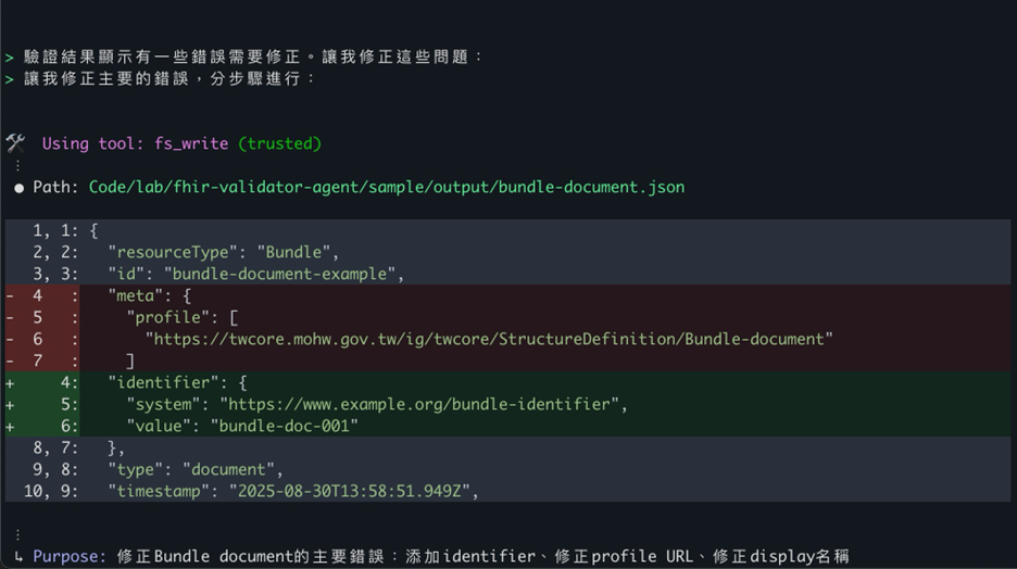 Amazon Q Agent結合FHIR validator MCP的解決方案,為台灣醫療器材與健康促進廠商提供一個高效、準確、易用的No-code量測資料初始FHIR格式轉換工具。這個方案智能的根據來源schema的欄位,查看相關範例以推薦對應的FHIR格式,並確保了轉換結果符合台灣核心實作指引的要求。讓我們一起推動台灣醫療資訊標準化的發展,為病患提供更好的醫療服務品質。