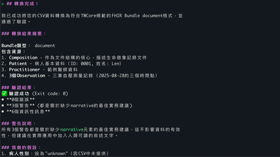 轉換前,你需要先閱讀https://twcore.mohw.gov.tw/ig/twcore/0.3.2/artifacts.html規範文件,及盡可能在https://twcore.mohw.gov.tw/ig/twcore/0.3.2/examples.html找到對應的資源的樣例。轉換及驗證後,輸出時,整理一下有哪些warning和informational的,提出使用者改進建議。如果過程中為了符合輸出格式,你有做一些假設欄位的值,也請列出來。
