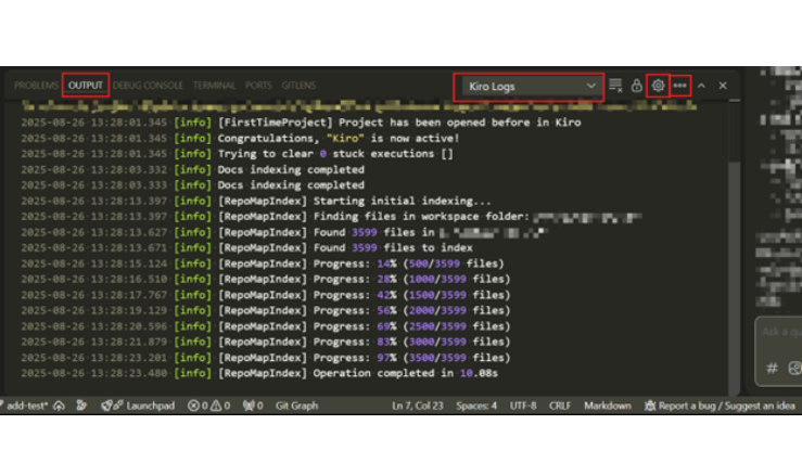 - 開啟 Kiro 的 OUTPUT。透過點擊選單列的 View,再點擊 Output 開啟面板