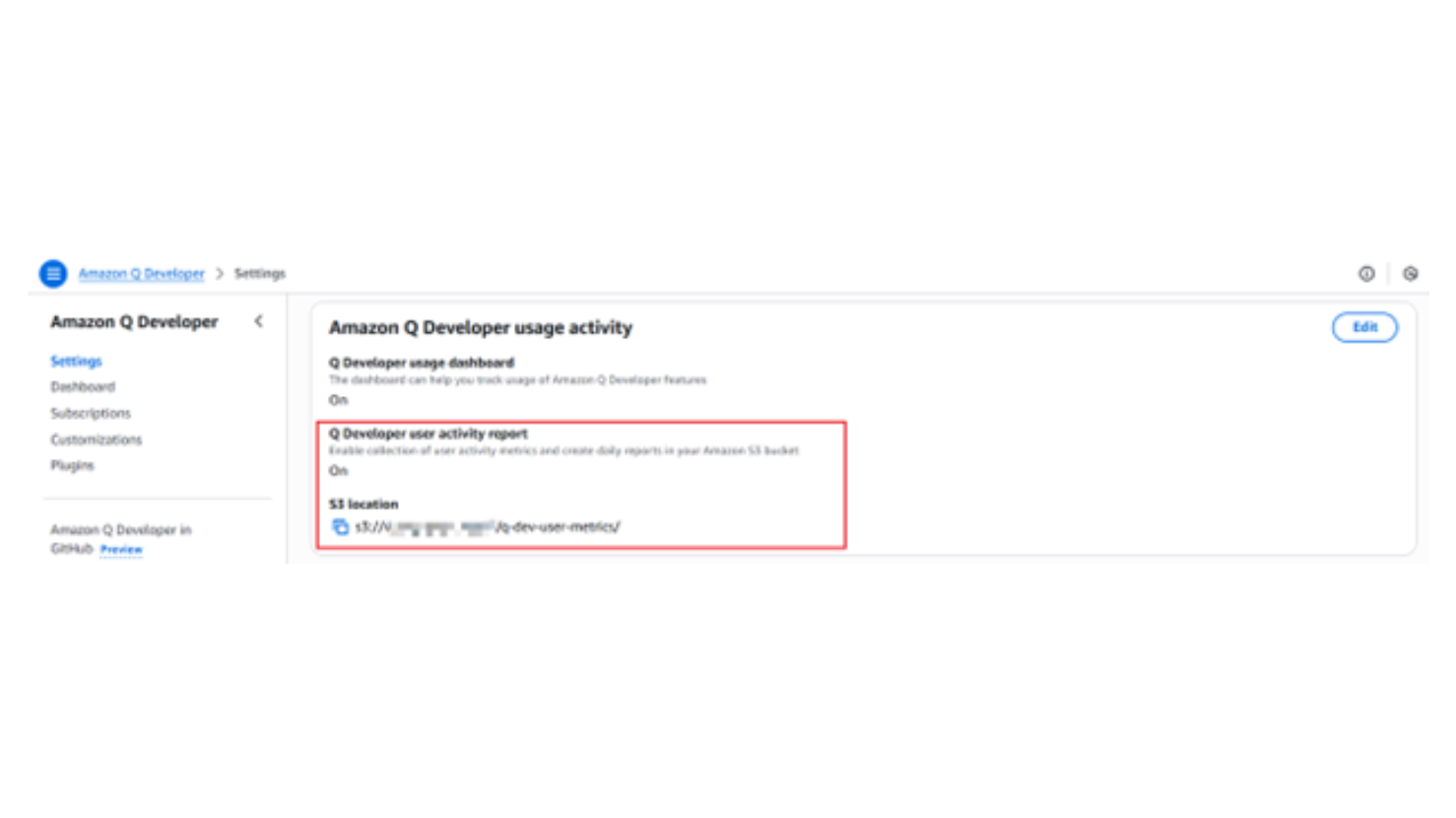 提供。Amazon Q Developer 提供 user activity report,可以提供使用者級別的指標。在 Amazon Q Developer 設定頁面啟用,並填寫一個您可以管理的 S3 地址。使用者級指標會被寫入到對應的 S3 地址中。