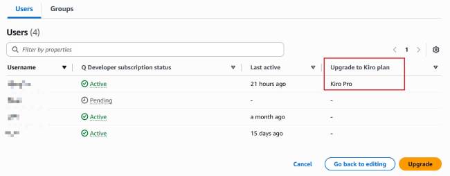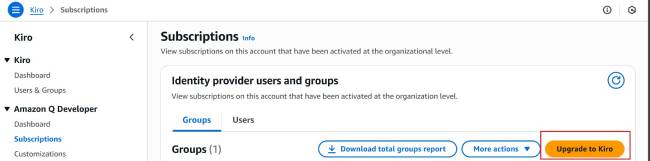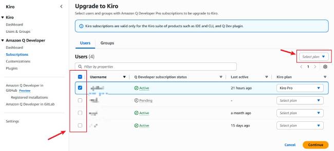 選擇要進行升級的用戶或組,然後點擊右上角選擇 Kiro Plan,然後點擊下一步
