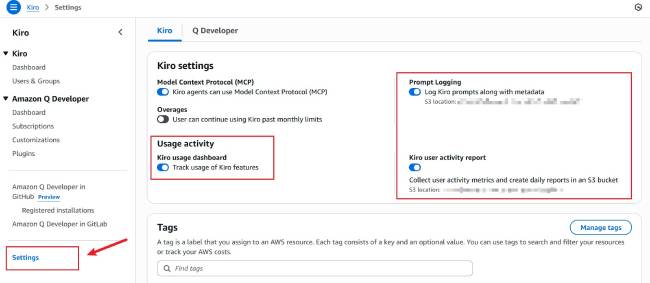 由於 Kiro 的數據指標和 Amazon Q Developer 的數據指標是兩套不同的系統,您還需要爲 Kiro 啓動 儀表板, Prompt 日誌記錄 和 用戶級指標 (User Activity Report)。